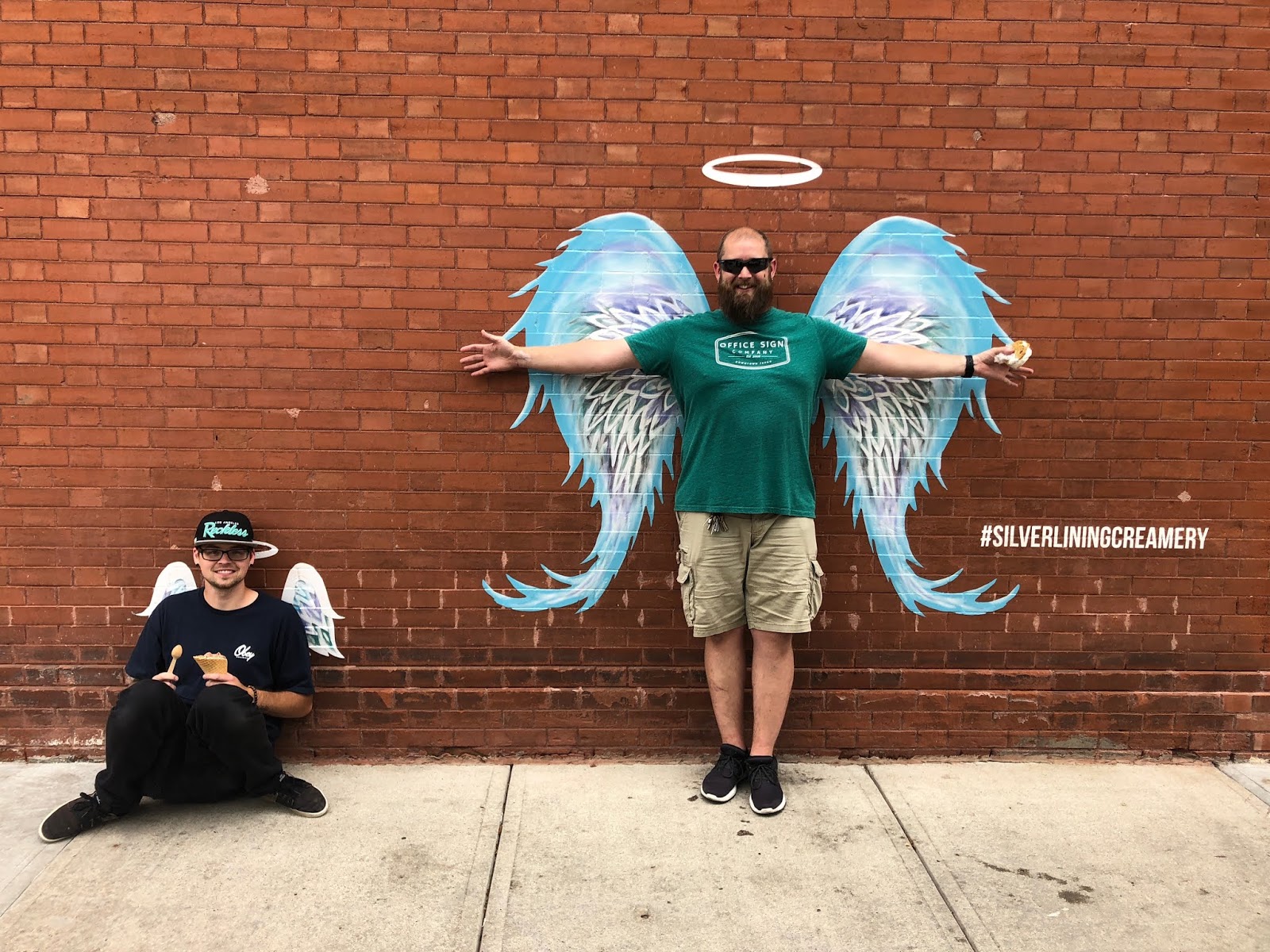 While perusing downtown, you may have come across these angel wings outside of Silver Linings Creamery. Perhaps one of the most interactive pieces we took part in, these angel wings (accompanied by angel wings for your dog) were designed by one of our very own artists, and installed by our talented team! We absolutely love seeing individuals, from kids to adults, engage with this fun idea. A huge thank you goes out to Michelle from Silver Linings Creamery for bringing wonderful ice cream and a fun idea to our downtown community.