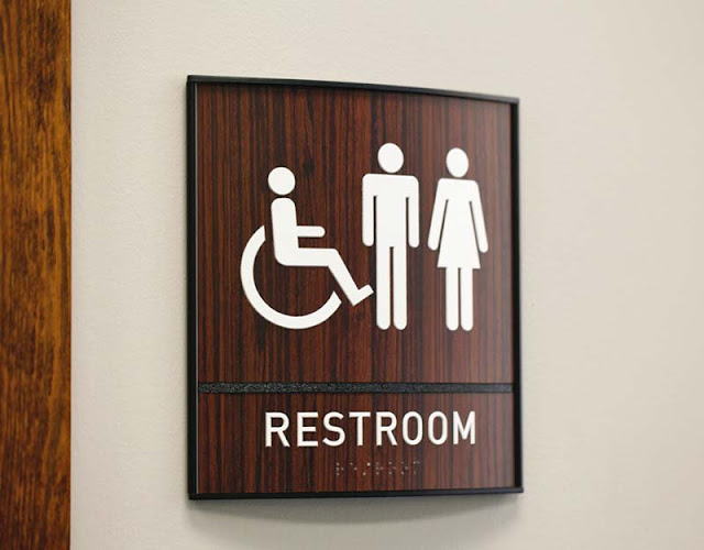 If you’re looking for this type of signage, consider where it will be going and how you can best match the sign to its environment. Our customizable signs have many different options when it comes to materials, color, and even build/shape, so you’ll have plenty to choose from. Usually, it will be good to go with more neutral colors, gray, black, silver, browns and dark blues, but if you can happen to find something that matches or compliments its surroundings (such as this restroom sign below), it can look even better!