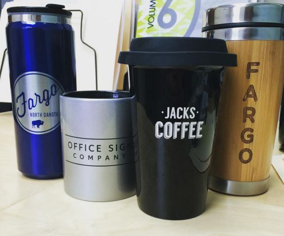 - Custom Mugs. Alright, a little aside here: I’ve drank coffee probably four times in my entire life. The fourth time was yesterday. It was awful. I don’t know how you all do that. Anyways, we offer custom mugs whether you are a coffee drinker, or whether you’re like me and pour a Dr. Pepper into your coffee mug to make it look like you are more sophisticated. Our standard products range from a variety of ceramic mugs with handles, to can and latte mugs which can be engraved into. We also offer full-color prints on white coffee mugs, which is a great way to tie your branding elements into your daily coffee mug. Because so many networking events nowadays involve the consumption of coffee, why not bring your own mug that shows off your company’s logo: (a) people will never not know whose mug it is and (b) you will get many compliments on what a creative idea it was. Thank me later.