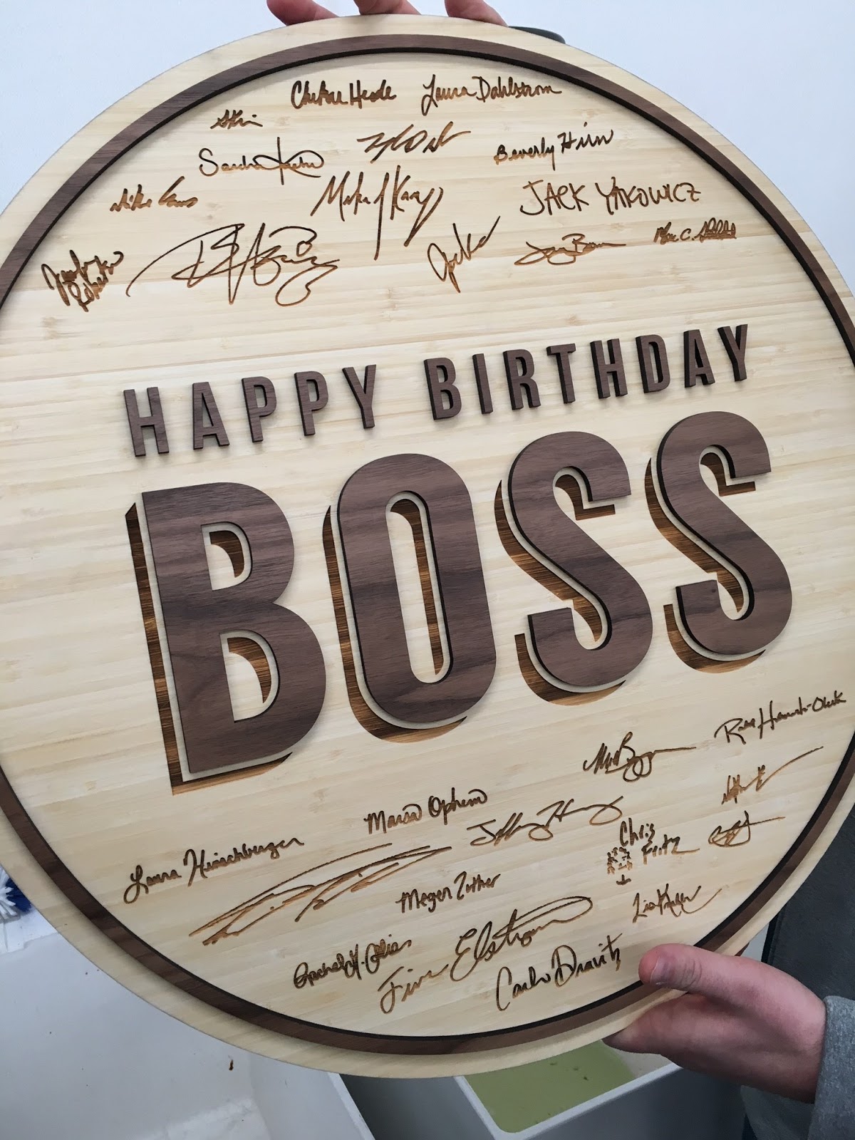 Alright, we’ve finally gotten to my favorite section. Since I started working at Office Sign Company, I have blown a decent amount of my paychecks on cool engravings from our shop. From the sets of bamboo coasters I ordered for relatives as Christmas presents, to the beer bottle opener that I had fabricated for my apartment, I certainly have benefitted from the talented craftsmanship of our engraving department. Given the fact that every business is wildly different, we also understand that clients have a variety of needs. We have a handful of Fargo clients that simply come to our office to take advantage of our laser and router engraving capabilities. For those who don’t know the difference, a laser engraver also burns into the substrate as it is engraving/etching. A router engraver can handle larger products, but cuts down into (or through) a substrate to engrave it. As we continue to experiment with new substrates, our capabilities as a company when it comes to custom engravings is ever expanding. Here are just a few of our specialities: